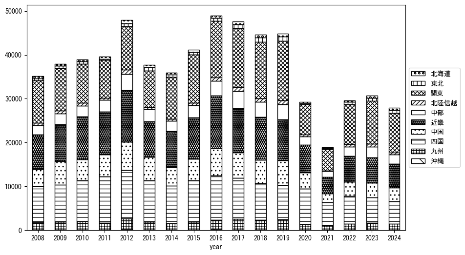 図3:愛媛県内の従業員数100人以上の宿泊施設での1か月あたり平均延べ宿泊者数(国外、居住地不詳を除く)の運輸局別内訳。