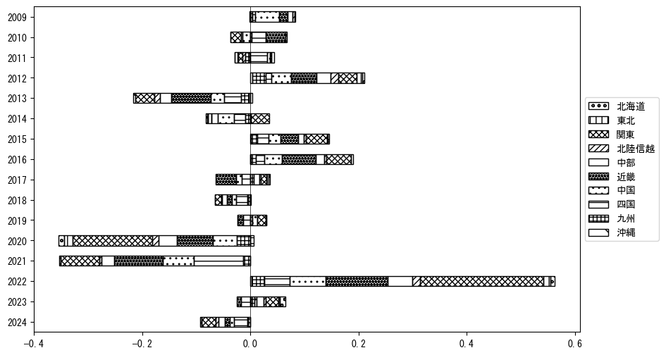 図7:愛媛県内の従業員数100人以上の宿泊施設での運輸局別延べ宿泊者数(国外、居住地不詳を除く)から求めた寄与度(月別)。